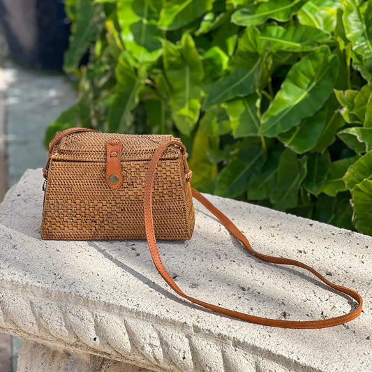 Rattan Cane Weave Handbag w/Brown Leather Trim