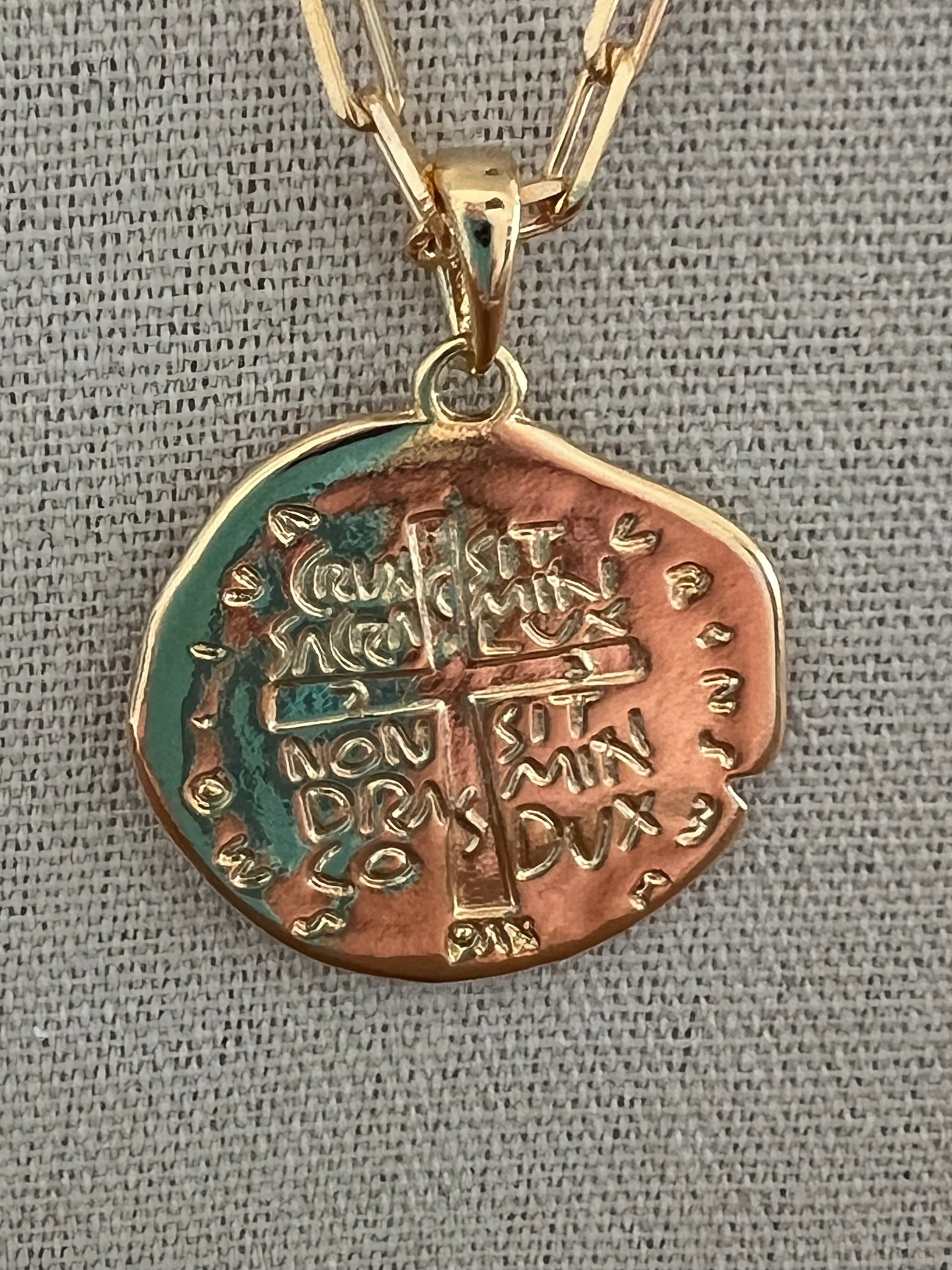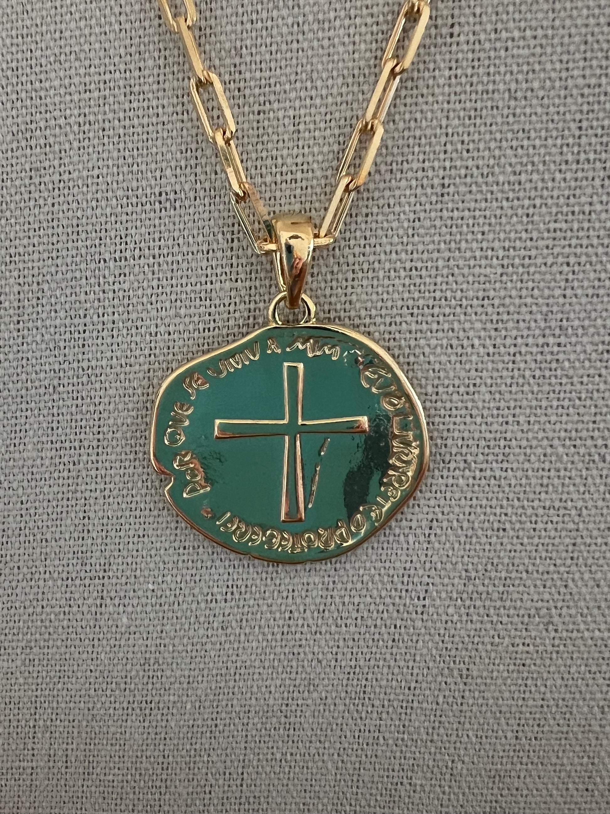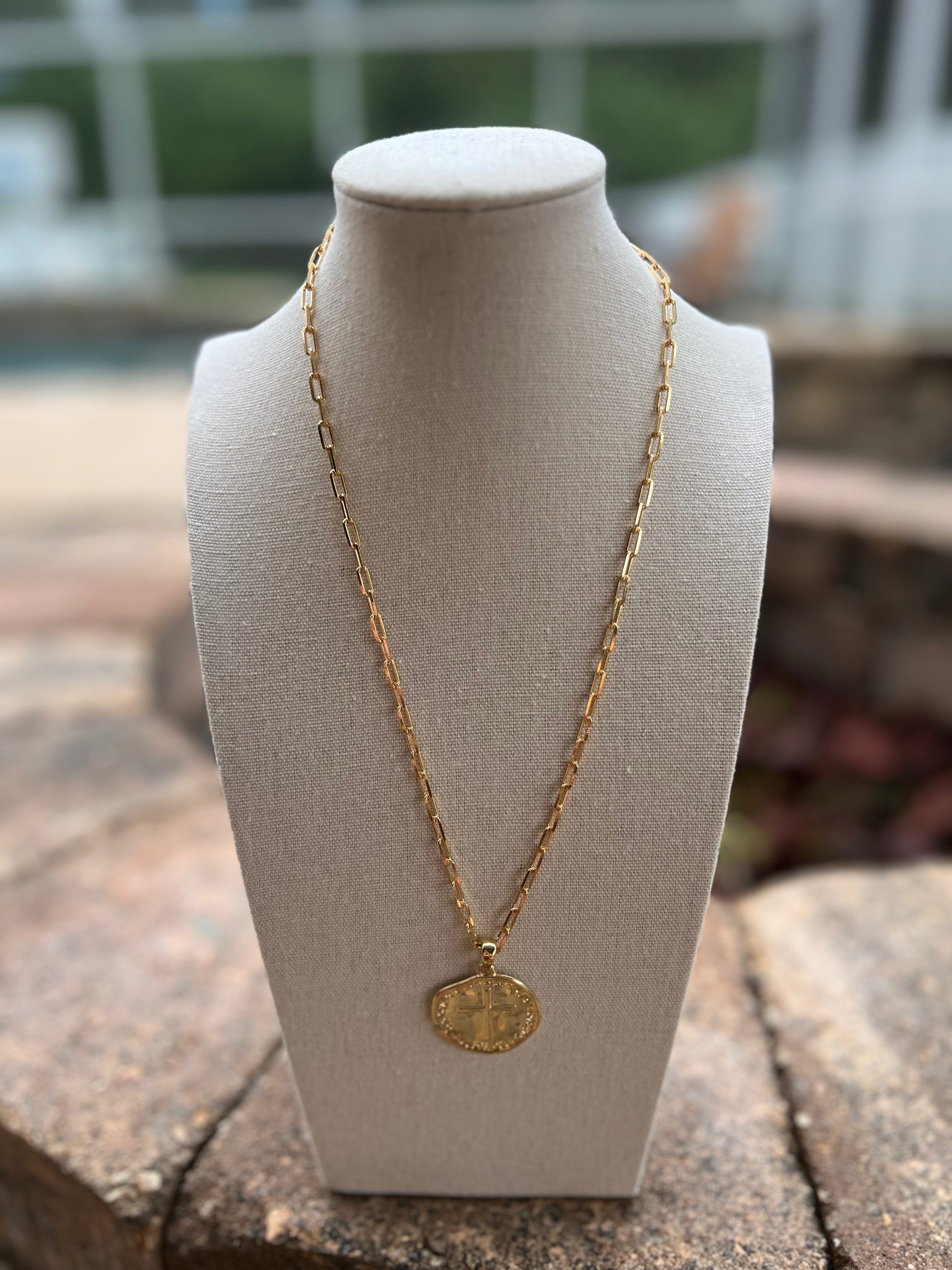 Vintage inspired coin with a cross on 18” paperclip chain.