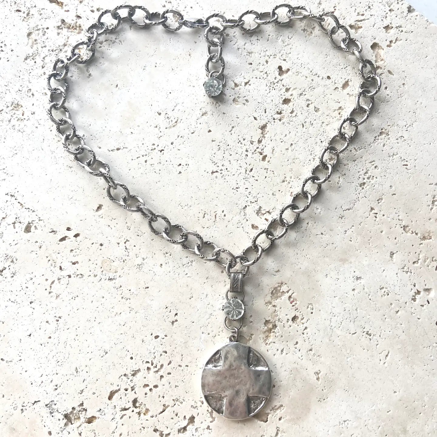 This necklace is very special. It’s hand casted from an actual vintage religious medal. It features the Lord’s Prayer on the backside of the coin pendant. Adjustable up to 19” the coin is 30mm. Choose your chain color. Available in matte gold or burnished silver. The detail on this chain is amazing. The chain weight is a perfect comfortable weight.