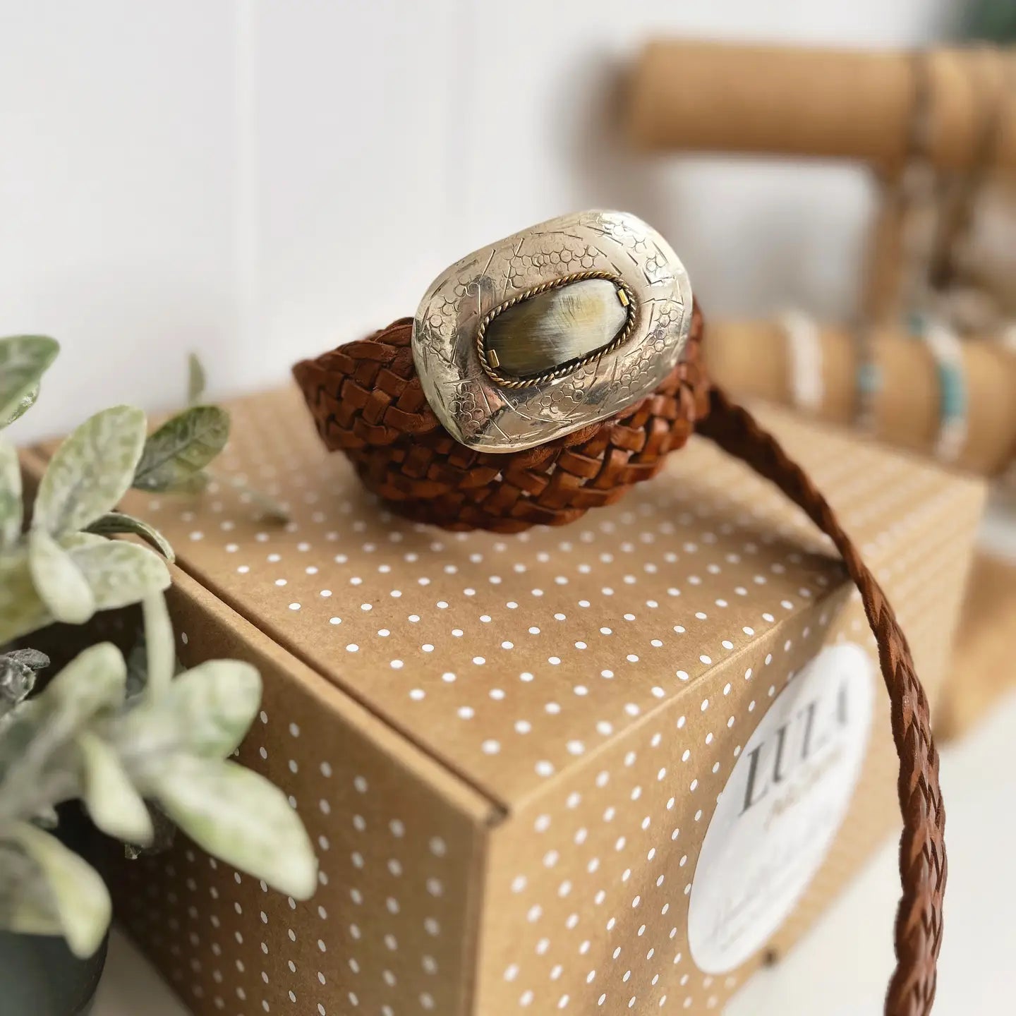 Braided genuine leather belt in brown color. Its elongated brass buckle with two-tone mother-of-pearl stone is the ideal detail to pair with any of your more summery and boho-style looks. Hook closure to fit any size. With a current and modern design, they are handcrafted, so the stones may have different shades.