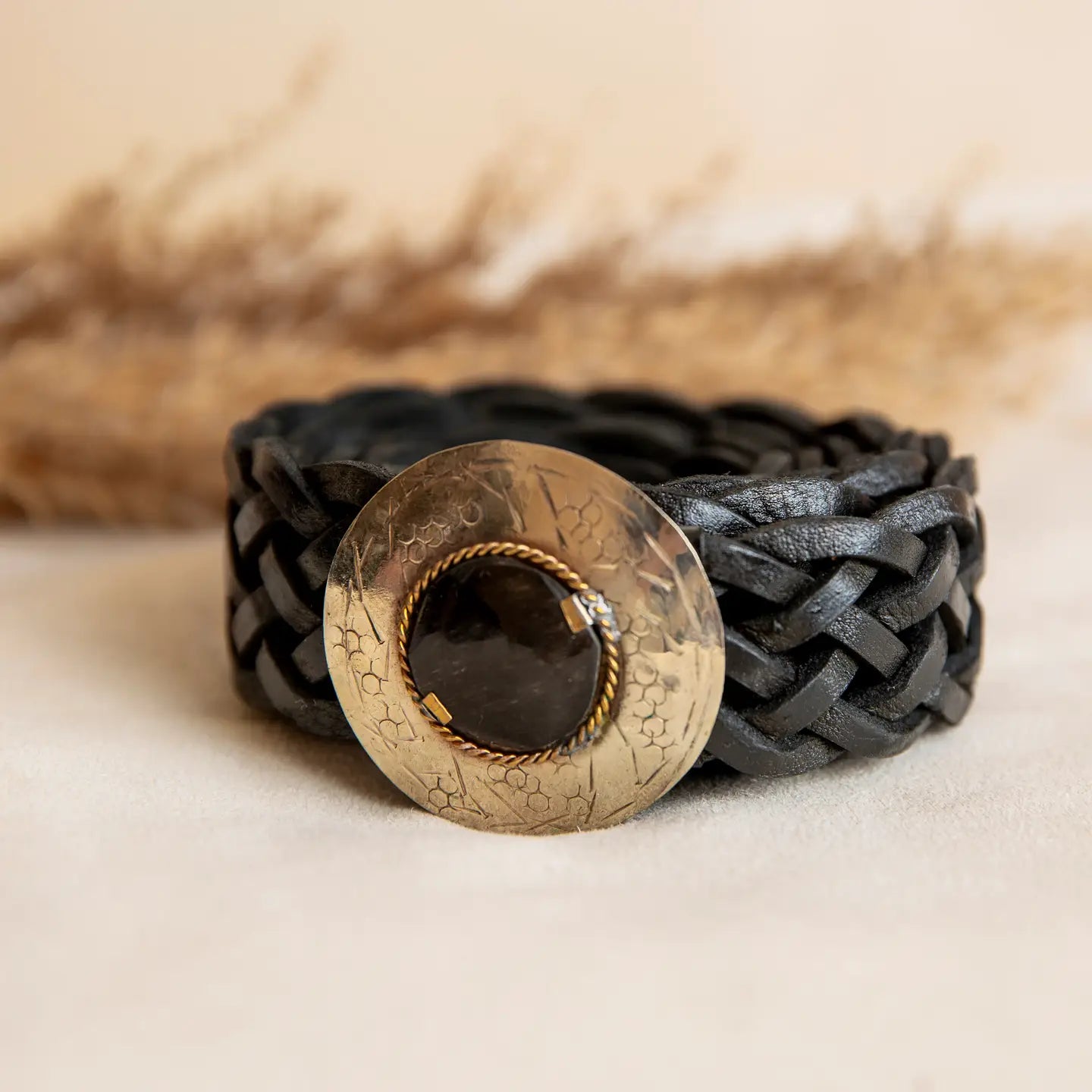 Braided belt made of genuine leather in black. Its round brass buckle with a mother-of-pearl stone in two shades is the ideal detail to pair with any of your more summery and boho-style looks. Hook closure to adapt to any size. With a current and modern design, they are handcrafted, so the stones may acquire different shades.