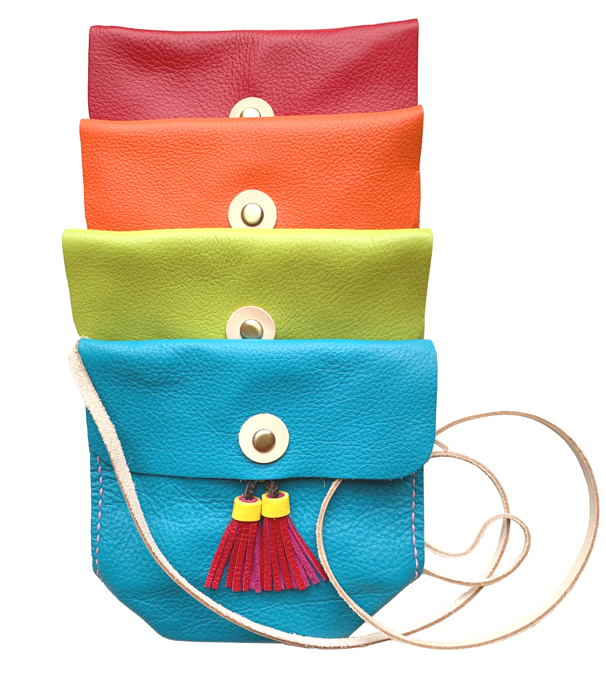 The Nora handmade leather purse is stylish and bold. It features a unique pick stitch design and fun colors. The snap closure ensures security, while tassels add a playful touch. It's both practical and eye-catching