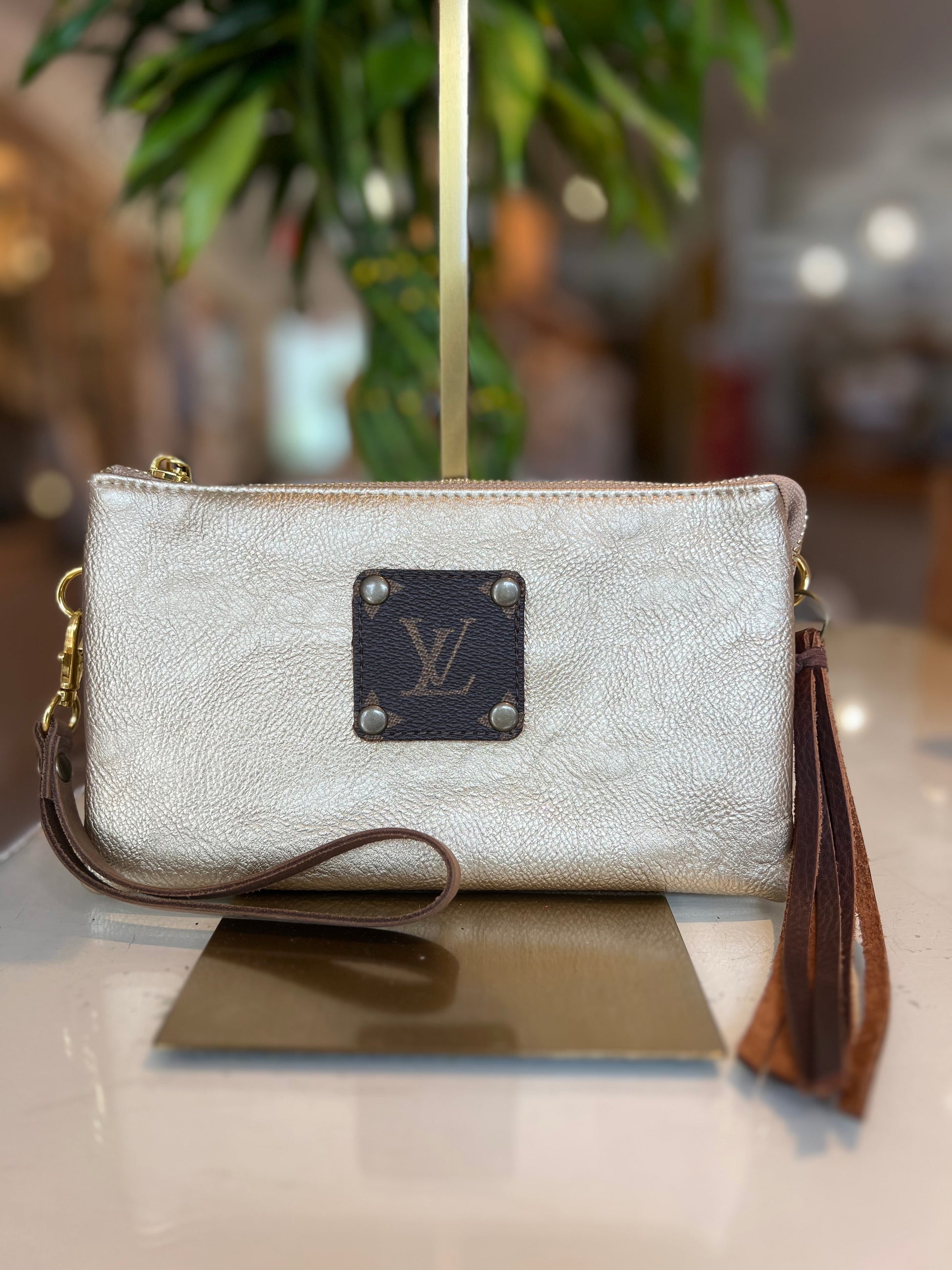 Zip top Inside has 3 zipped compartments to hold items 2 compartments with 6 credit card slots. Will hold money, lipstick and other items as well. Center zipper for coins or money. Leather fringe tassel with bling Removable leather wristlet strap 48" antique bronze chain strap LV patch with antique bronze rivets 8.5" x 5.5" Side Body made of Buttery luxurious material inside and out. Easy to clean. Color: Gold