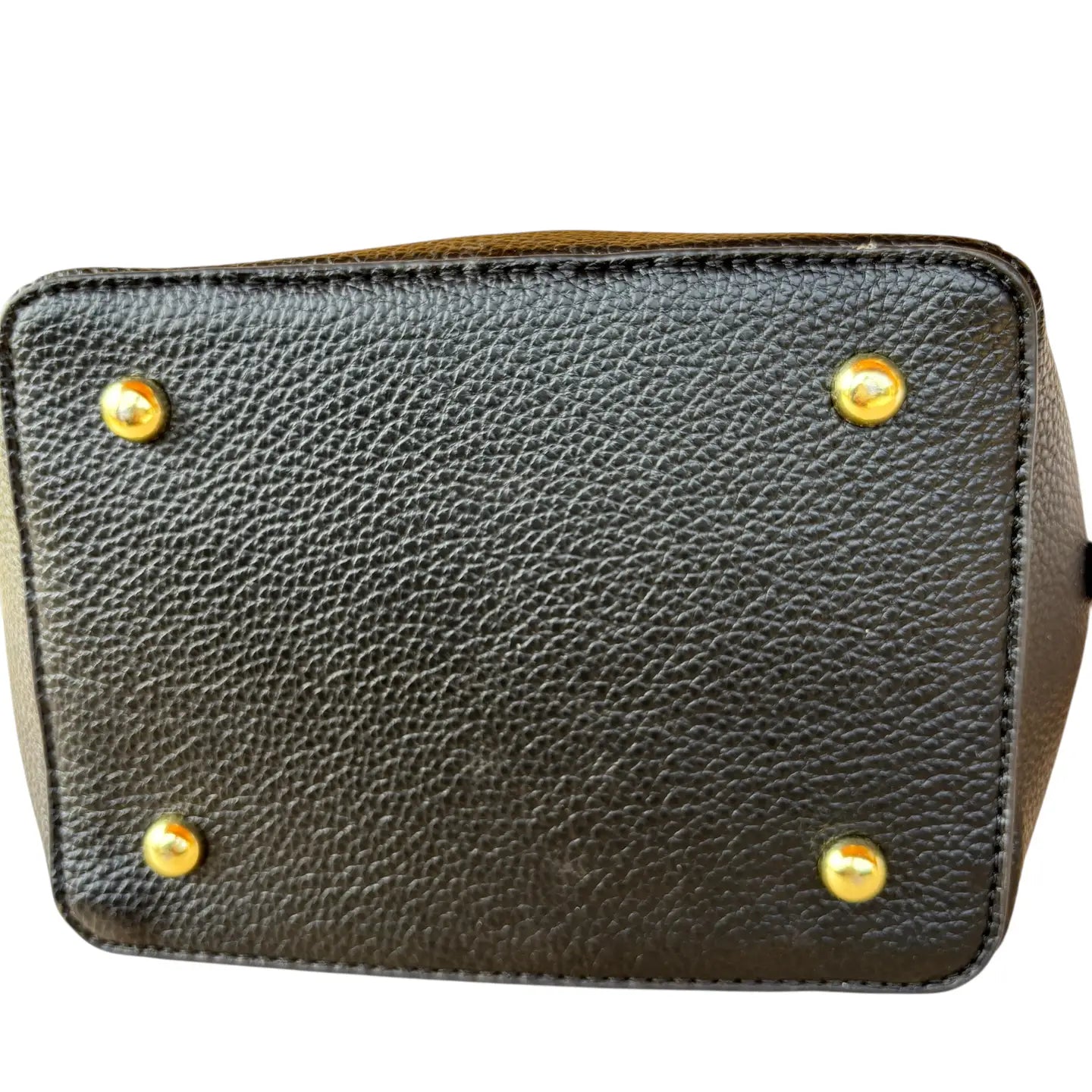 Elevate your accessory game with this black bucket bag, featuring sturdy handles and a versatile crossbody strap for hands-free convenience. Crafted from upcycled materials, it combines sustainability with style, making it a smart choice for the fashion-forward. The included scarf adds a chic accent, allowing you to personalize your look while embracing the latest trends. Perfect for everyday use or special outings, this bag balances form and function with expert design detail. 9x5x5 actual bag size.