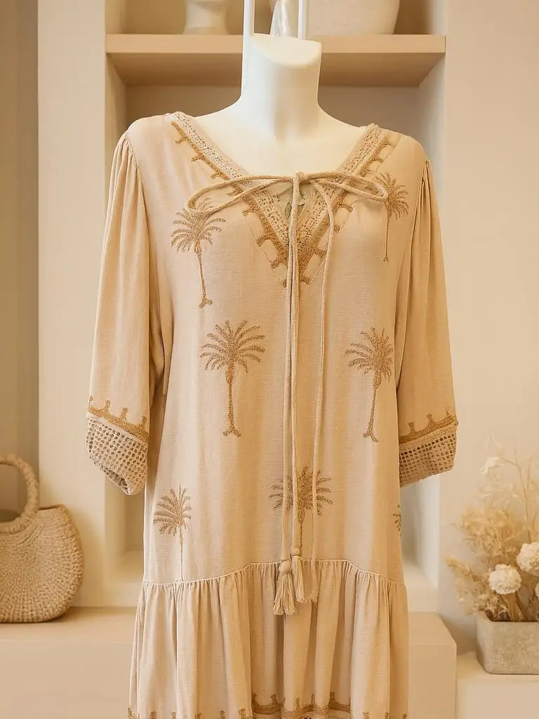 Beautiful white boho-style dress, made of linen and organic cotton fabric in brown with hand-printed golden tones that give it a tropical and original touch. Its loose design offers total comfort, while the V-neck with drawstring and puffed sleeves give it a feminine touch.