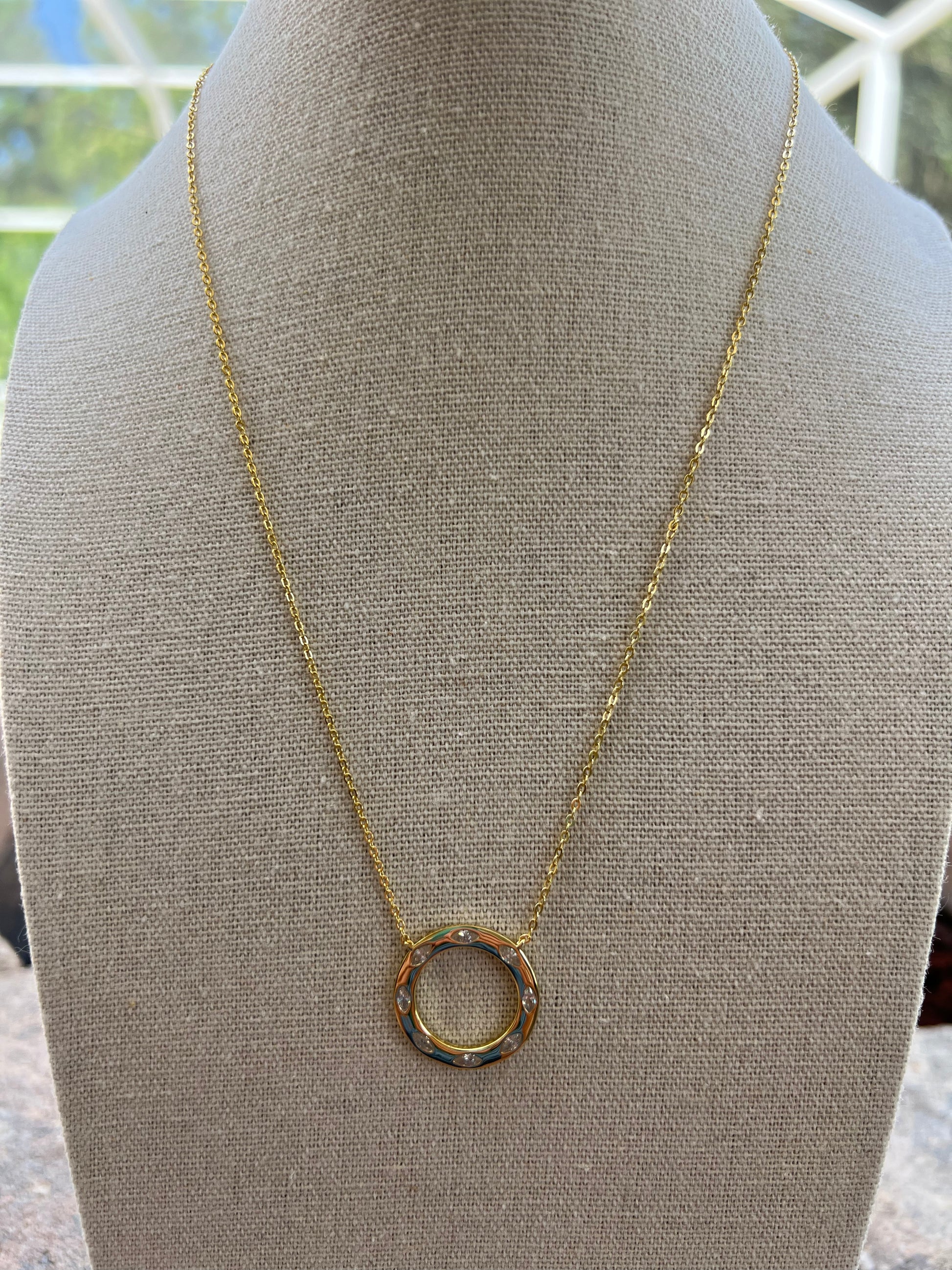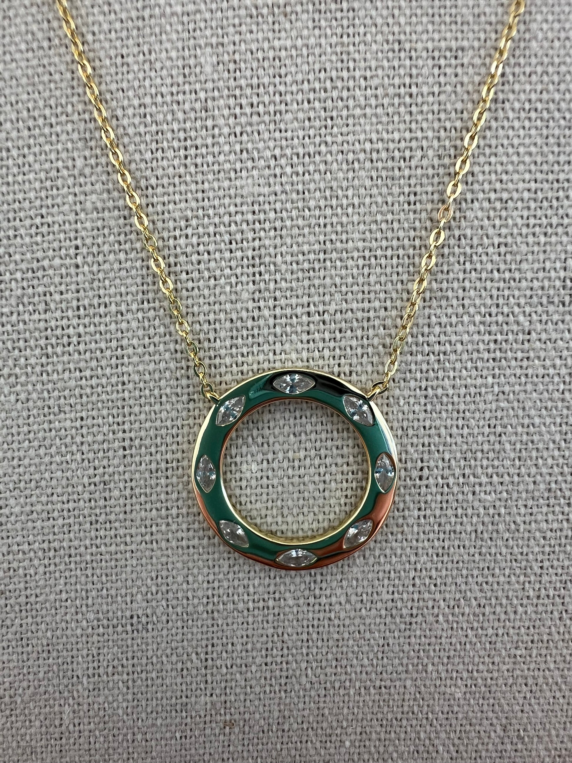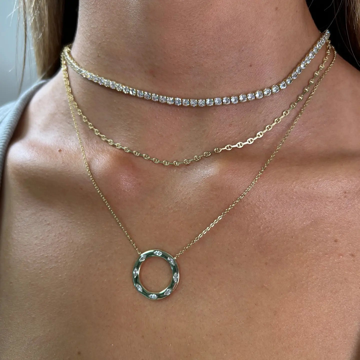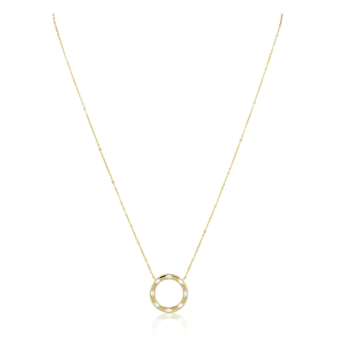 The Oasis Eternity Necklace features a stunning circle pendant embellished with sparkling CZ stones. Elevate your everyday look with this elegant and timeless piece.