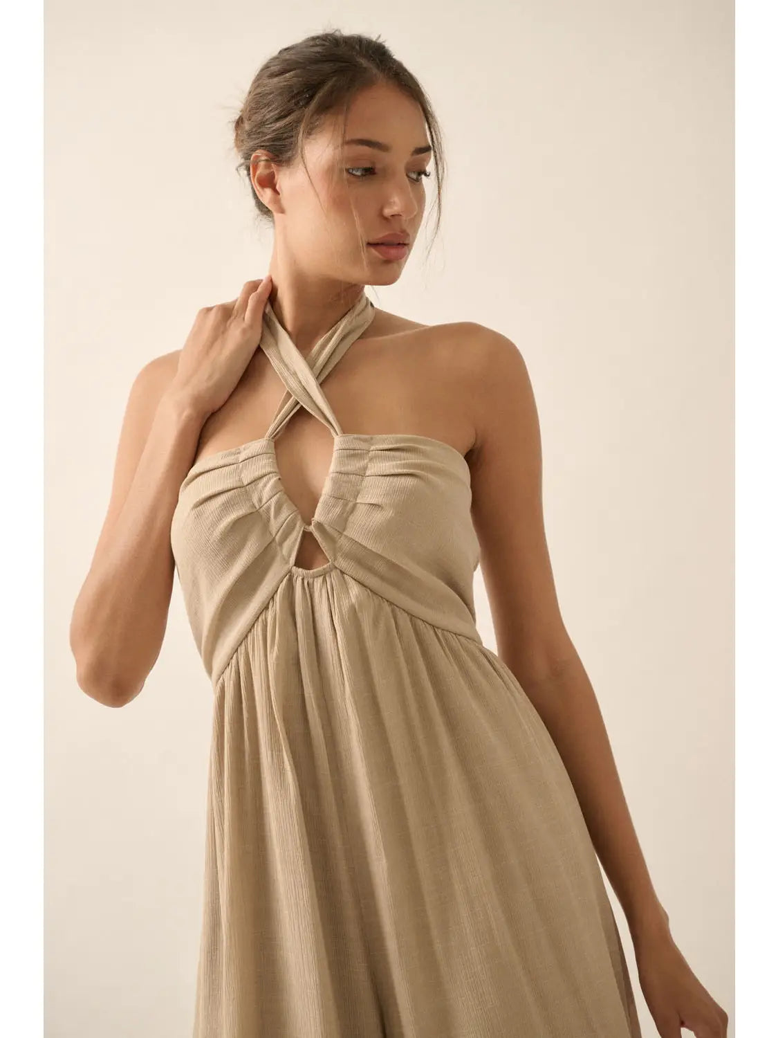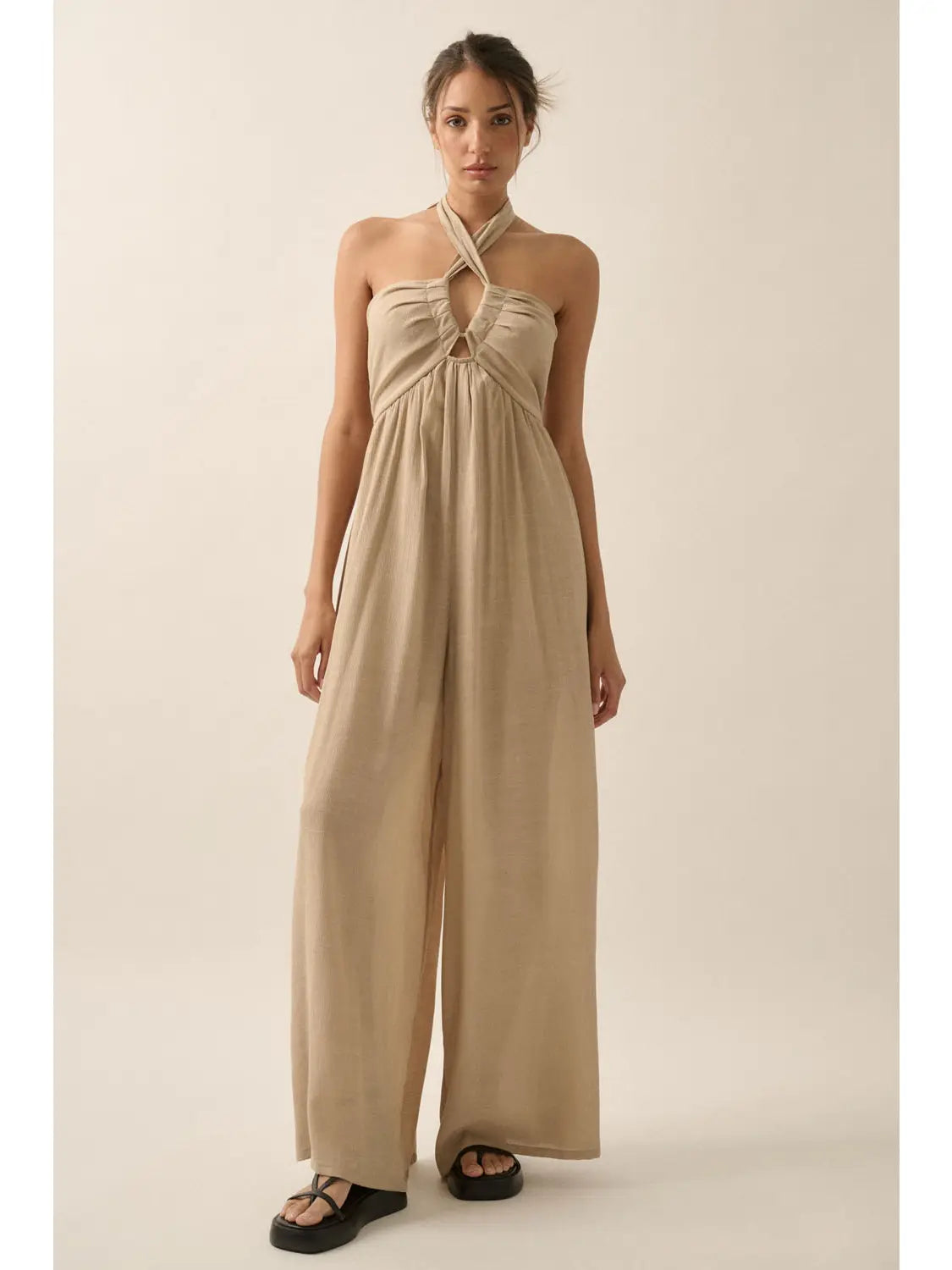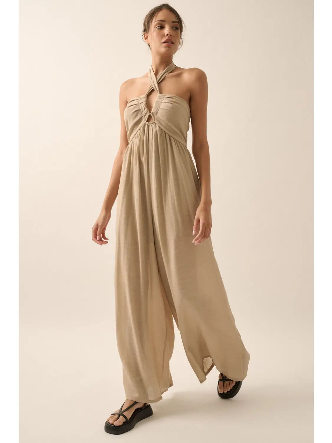 Solid Cotton Blend Wide Leg Halter Jumpsuit-Stone