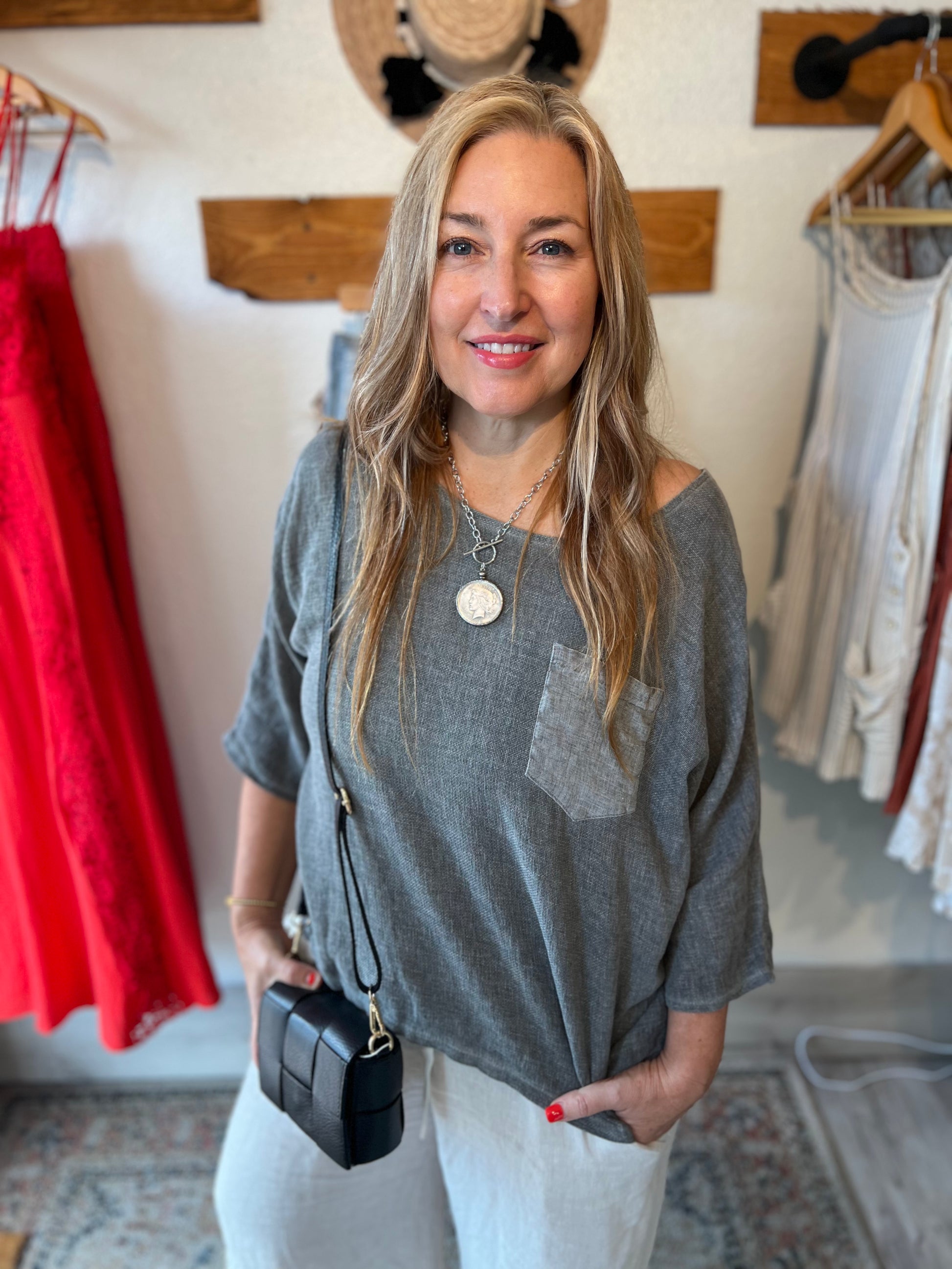 Gauze 3/4 Sleeve Pocket Top-Gray
