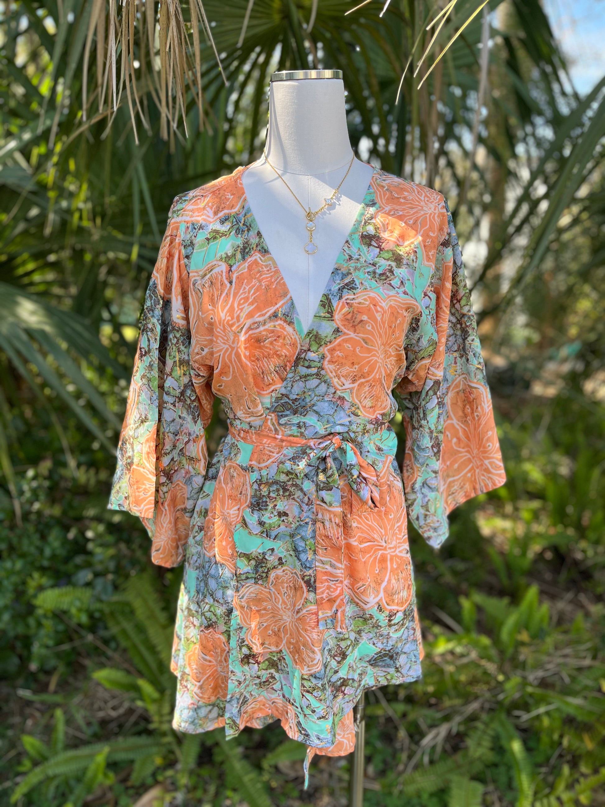 This exquisite 3/4 sleeve Kimono Top offers the timeless versatility to be worn either traditionally tied, tied together at the midsection, or tied higher for a modernized, boho-chic look. The Willow Kimono top is a great coverup at the beach or as a bathrobes