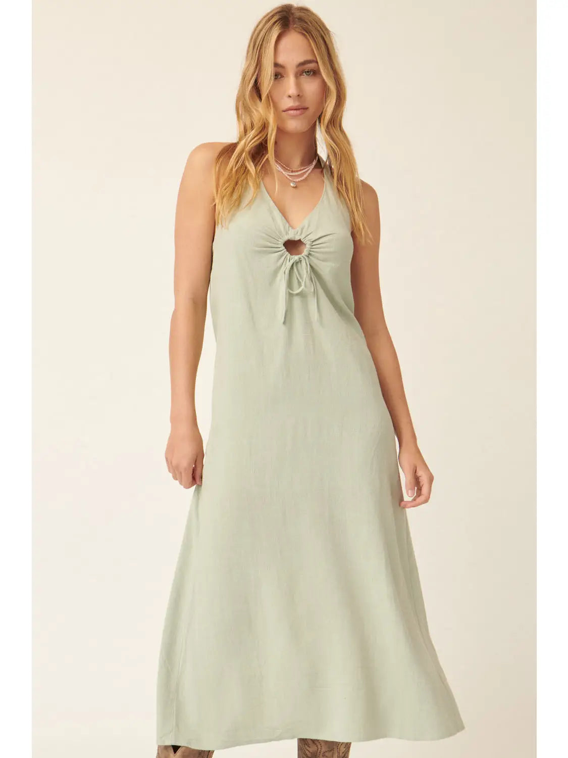 Solid Woven Keyhole Open Back Maxi Dress-Seagrass