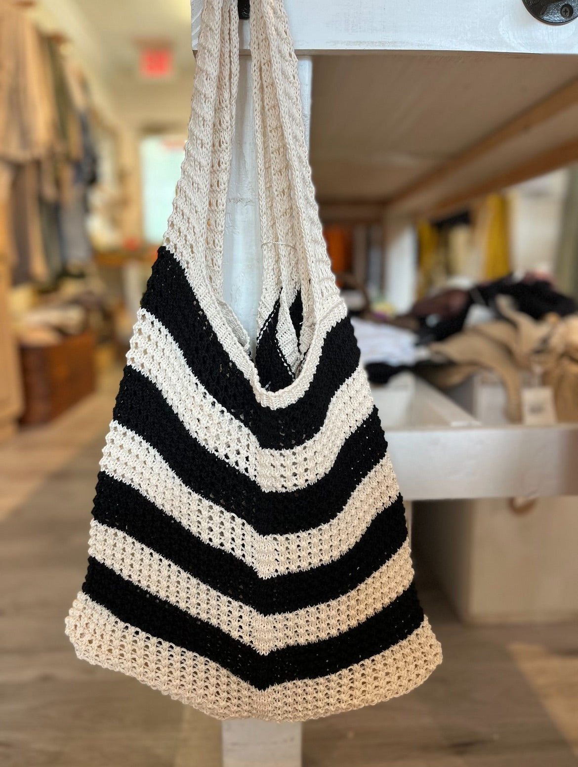 Stripe Knit Crochet Beach Bag-Cream/Black